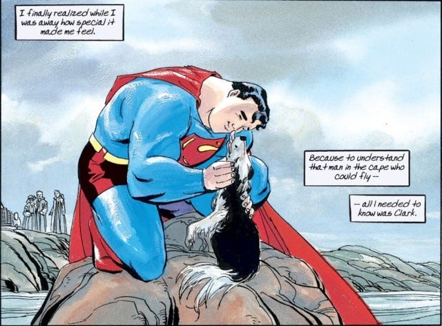 For all that I want to say, I have to make sure that you, Dear Reader, have some knowledge about Superman's origin. As most people know, he came from Krypton, and his parents sent him away as the planet was being destroyed. Landing in a cornfield in Kansas, he is adopted by Jonathan and Martha Kent, leading to him growing up as “normal” Clark Kent on Earth.